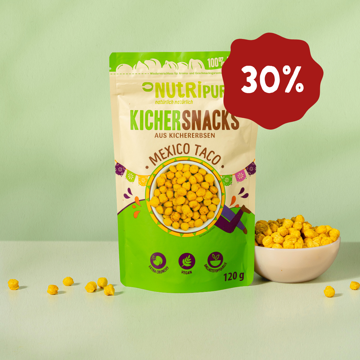 Mit dem NutriPur Kichersnack „Mexico Taco“ kommt das Snack-Erlebnis direkt zu dir nach Hause, ins Büro oder begleitet dich unterwegs auf all deinen Abenteuern. Unsere runden Kichererbsen-Chips mit Taco-Geschmack bieten dir genau das, was du dir wünschst: herzhafter Crunch, würzige Aromen und wertvolle Nährstoffe – perfekt für alle, die sich bewusst ernähren wollen, ohne auf guten Geschmack zu verzichten.