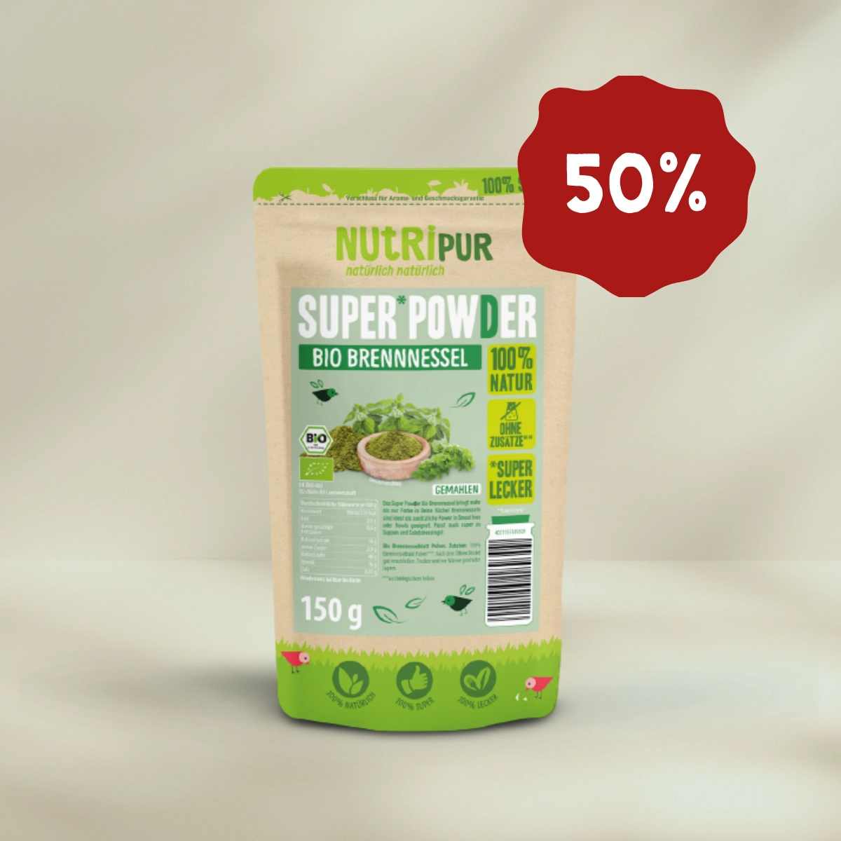 Hier ist ein Produktbild vom SuperPowder Bio Brennnessel-Pulver von NutriPur. Jetzt 50 Prozent Rabatt + Hier ist ein Produktbild vom SuperPowder Bio Hagebutte von NutriPur. Jetzt 30 Prozent Rabatt. + Hier ist ein Produktbild vom SuperPowder Bio Moringa von NutriPur. Jetzt 30 Prozent Rabatt